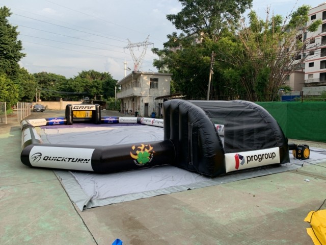 Banen er konstruert av slitesterk 0,55 mm PVC-duk, noe som garanterer enestående holdbarhet og sikkerhet selv under hyppig bruk. Til tross for sin solide konstruksjon veier hele banen kun 80 kg, noe som gjør den overraskende enkel å transportere og sette opp. Dette betyr at du raskt kan få banen klar for bruk, uansett hvor arrangementet skal finne sted.