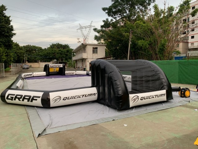 Banen er konstruert av slitesterk 0,55 mm PVC-duk, noe som garanterer enestående holdbarhet og sikkerhet selv under hyppig bruk. Til tross for sin solide konstruksjon veier hele banen kun 80 kg, noe som gjør den overraskende enkel å transportere og sette opp. Dette betyr at du raskt kan få banen klar for bruk, uansett hvor arrangementet skal finne sted.